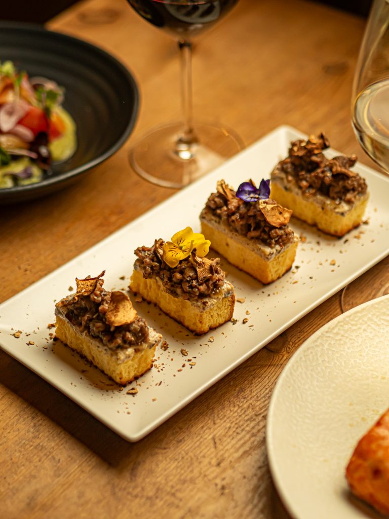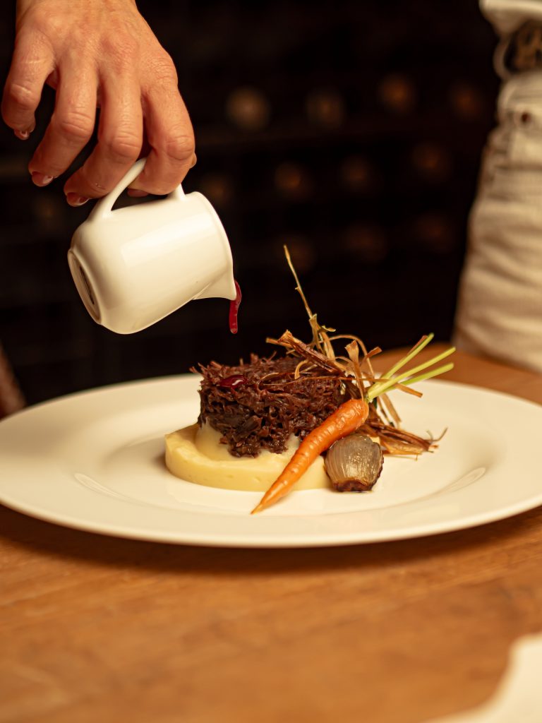 En la mesa, este relato se traduce en platos que reivindican el valor del tiempo y el fuego lento. Sabores como el brioche de butifarra de payés con trufa y setas o la ensalada de pato con vinagreta de mostazas y miel nos transportan a una tradición de bosque y agridulces muy arraigada en el recetario catalán. El bacalao, servido con almendras e higos, o el meloso de carrilleras al vino rancio, son testimonios de una memoria viva que utiliza el producto de proximidad para contar historias antiguas con un lenguaje actual. Incluso el postre, una lectura contemporánea del «mel i mató», devuelve al comensal a la esencia del territorio.