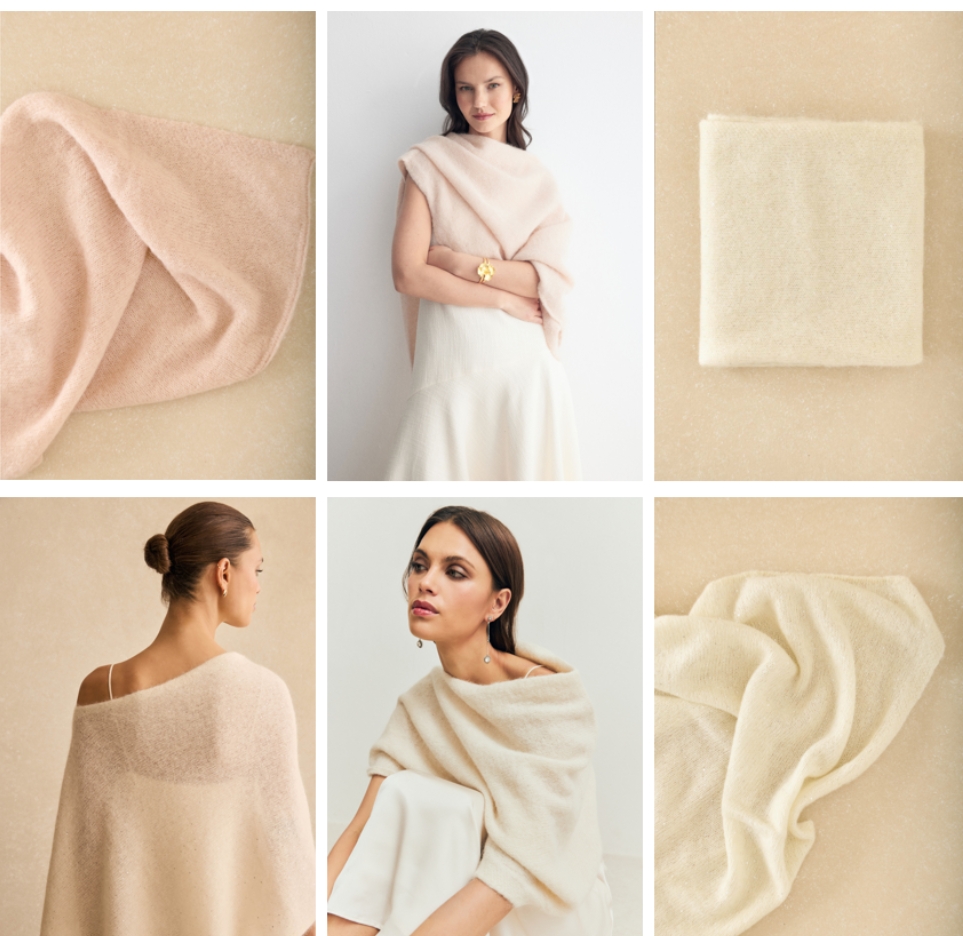 La colección refuerza la identidad de BIMANI con el uso de materiales nobles trabajados en clave contemporánea. El tweed reinterpretado se convierte en protagonista en chaquetas, blazers o conjuntos de dos piezas, aportando estructura sin rigidez. El mohair ligero, presente en ponchos y complementos, suma calidez y suavidad, ideal para celebraciones al aire libre. A ello se suman gasas, tules bordados y satén texturizado, tejidos que juegan con la luz y aportan movimiento y discreto brillo.