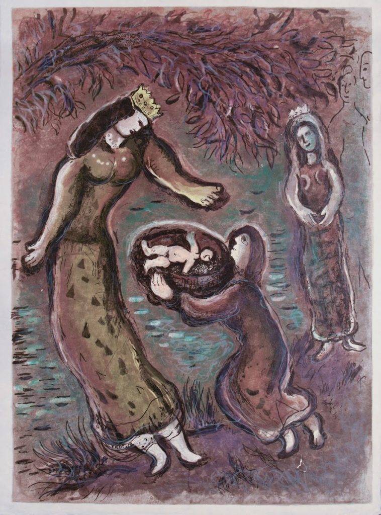 Imagen: La adoración de Moises (Moises salvado de las aguas por la hija del Faraón) de Marc Chagall.
