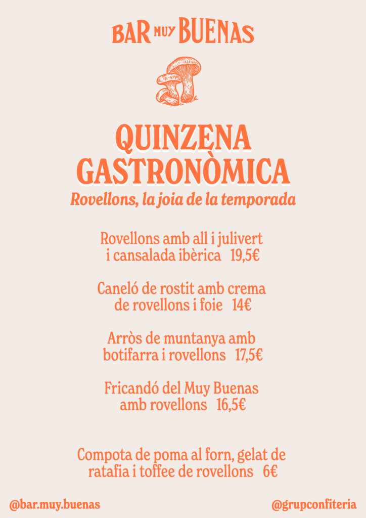 El Bar Muy Buenas, uno de los locales más emblemáticos del Raval y parte de Grup Confiteria, inaugura La Quincena Gastronómica del 20 de octubre al 2 de noviembre, con cinco platos especiales que rinden homenaje al rovellón (níscalo), el gran protagonista de la temporada.
