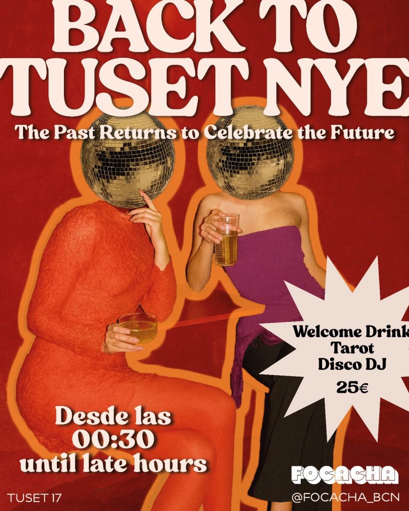 Como contrapunto, Focacha presenta una propuesta disruptiva en la calle Tuset bajo el concepto “Back to Tuset NYE. The past returns to celebrate the future”. Esta coctelería speakeasy apuesta por una noche de carácter místico por un precio de 25 €, con una consumición de bienvenida incluida. La experiencia trasciende la fiesta convencional al incorporar a una tarotista profesional que leerá el futuro a los asistentes, enmarcado en una cuidada sesión de música disco que se prolongará hasta la madrugada.