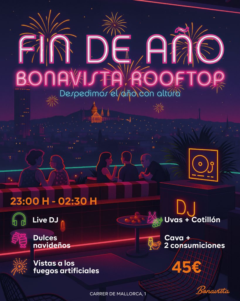 Para aquellos que buscan una despedida de año marcada por la exclusividad visual, Bonavista Rooftop se posiciona como el escenario de referencia. Este espacio ofrece una panorámica privilegiada sobre el skyline barcelonés, permitiendo disfrutar del espectáculo pirotécnico en un entorno de alta gama, todo ello por un precio de 45 €. La propuesta de Bonavista integra la tradición de las uvas, cotillón y dulces navideños, junto a un brindis de cava y dos consumiciones. El lema de esta experiencia es claro: “Despedimos el año con altura”.