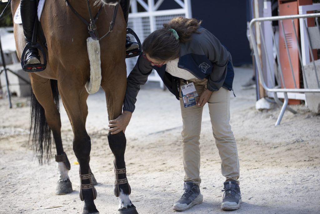 El trabajo empieza desde que los caballos llegan tras largas horas de viaje: control de temperatura, chequeo de tendones y músculos, revisión de la dieta y estado general. Después, la inspección dinámica determina si el animal está listo para competir: un trote frente a los jueces revela dolor o signos de estrés. Solo si pasa ambos controles, puede entrar en pista.