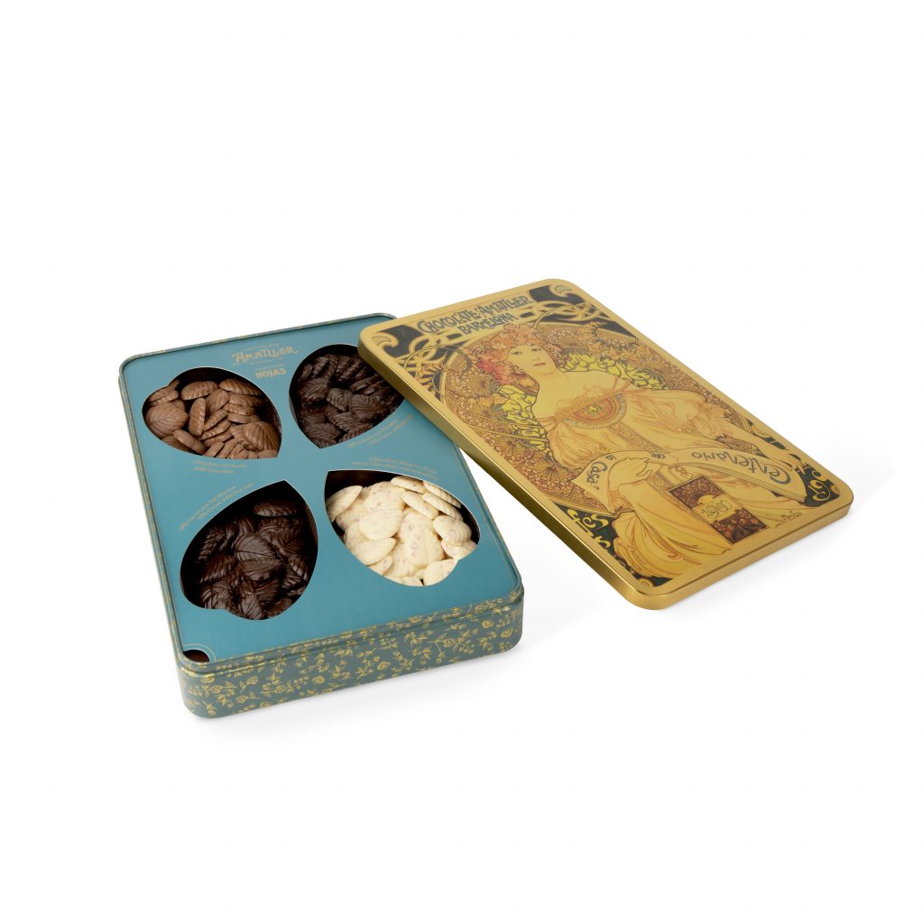 Su lata más codiciada luce el cartel que Alphonse Mucha diseñó para la marca en 1900, un tesoro del modernismo que convierte cada degustación en un viaje cultural. Dentro, una sinfonía de hojas finas se funde lentamente: chocolate negro 70 % con sal marina, una nueva propuesta de 70 % con naranja exclusiva de esta edición, un sedoso chocolate con leche y un delicado blanco con fresa, perfecto para quienes buscan suavidad y frescor.