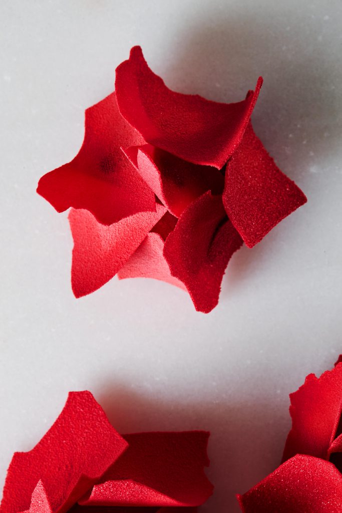 La creación de este año destaca por una complejidad técnica que se traduce en una experiencia sensorial única. El pastel se asienta sobre una base de exquisito bizcocho de chocolate y una galleta crujiente de vainilla, proporcionando una estructura sofisticada. En su núcleo, una sutil compota de lichis y rosa aporta notas florales que evocan la esencia de la festividad, mientras que una mousse suave de chocolate negro y frambuesas envuelve el interior con intensidad. El conjunto se remata con delicados pétalos de frambuesa, que no solo recrean visualmente la flor tradicional, sino que añaden el contraste ácido necesario para elevar la degustación.