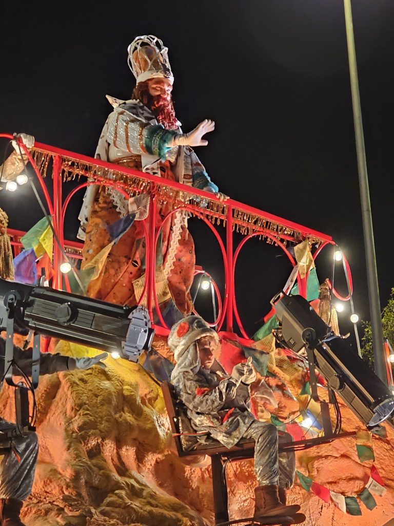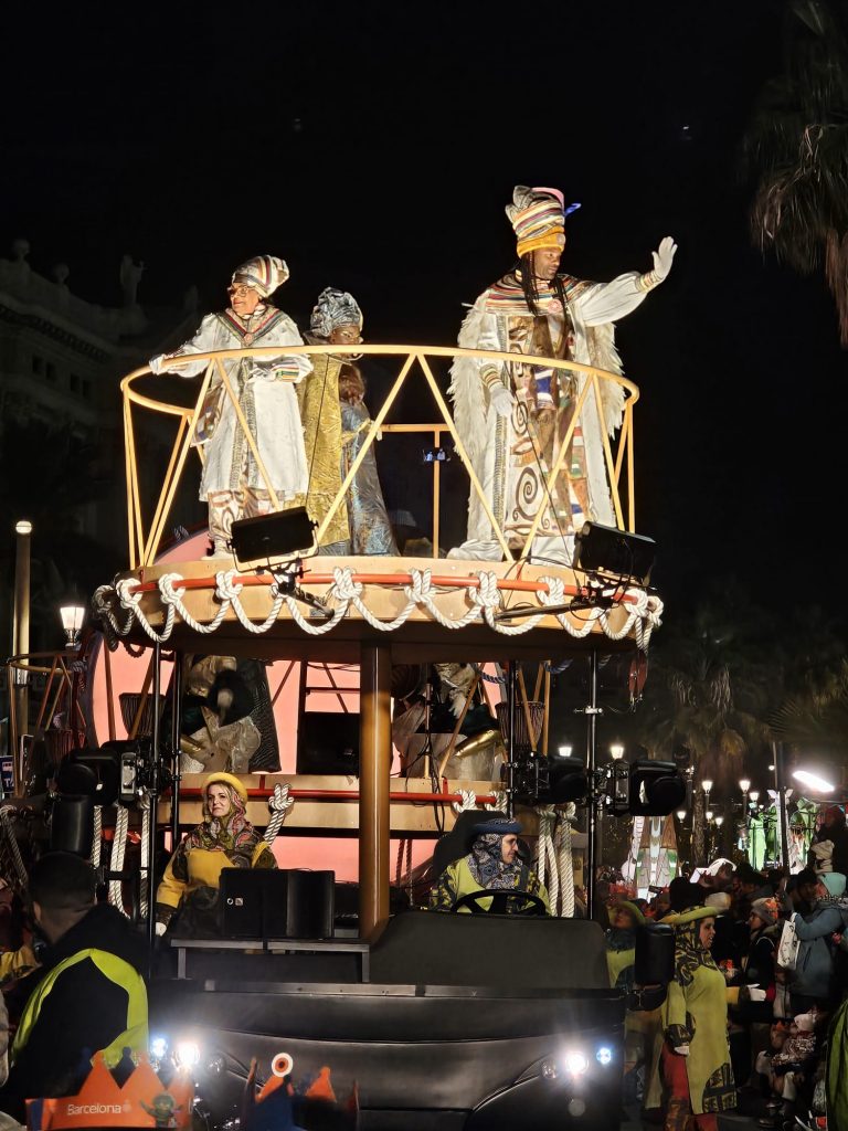 El rey Baltasar tuvo un protagonismo especial este año, estrenando una carroza de doble plataforma que reflejaba la riqueza cultural africana. Los ritmos vibrantes de los djembés y los sonidos del sabar senegalés acompañaron a Baltasar, quien fue aclamado por los espectadores con cada paso de su majestuoso séquito. Además, detrás de su carroza, se movían animales gigantes como jirafas y elefantes, obra de un reconocido artista sudafricano, que hicieron la magia aún más palpable.