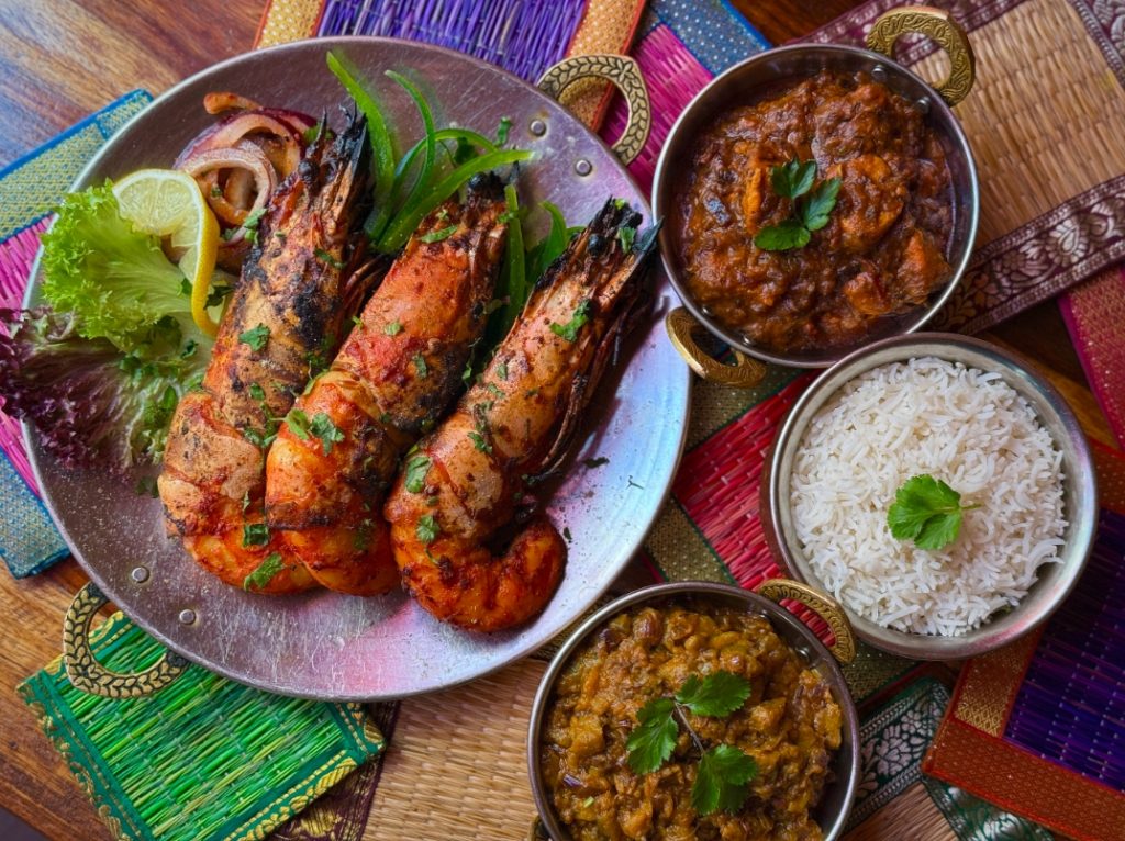 El festival cromático continúa con especialidades que demuestran la madurez de su cocina. Destacan el Acharei Chicken, un homenaje a los encurtidos con notas ácidas y picantes, y el sugerente Mango Pollo, que juega con el dulzor del chutney y la frescura del mango verde. Para quienes buscan el mar, los Gambones al Tandoor se presentan como el plato fuerte: marinados en yogur y especias, conservando una jugosidad que solo el horno de barro permite alcanzar.