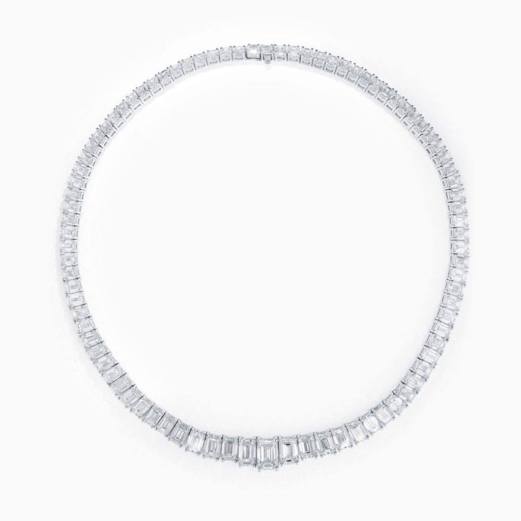 Un clásico reinterpretado con maestría: la pureza geométrica de la talla esmeralda crea un río de luz que abraza el cuello con elegancia radiante.