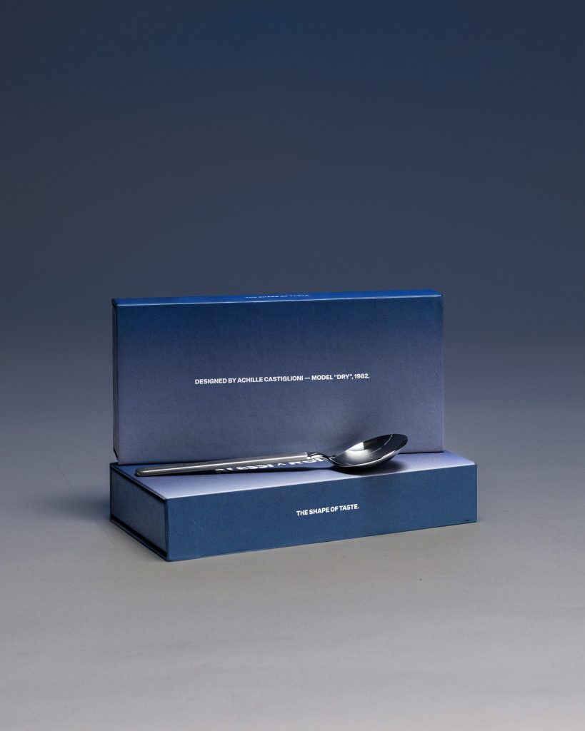 Pero lo que realmente convierte esta colaboración en un verdadero hito es la Tortellino Spoon, una pieza de coleccionista que ya está conquistando el mundo del diseño. Este elegante utensilio de acero es una reinterpretación de un diseño histórico del maestro Achille Castiglioni, famoso por crear piezas icónicas como la lámpara Arco.